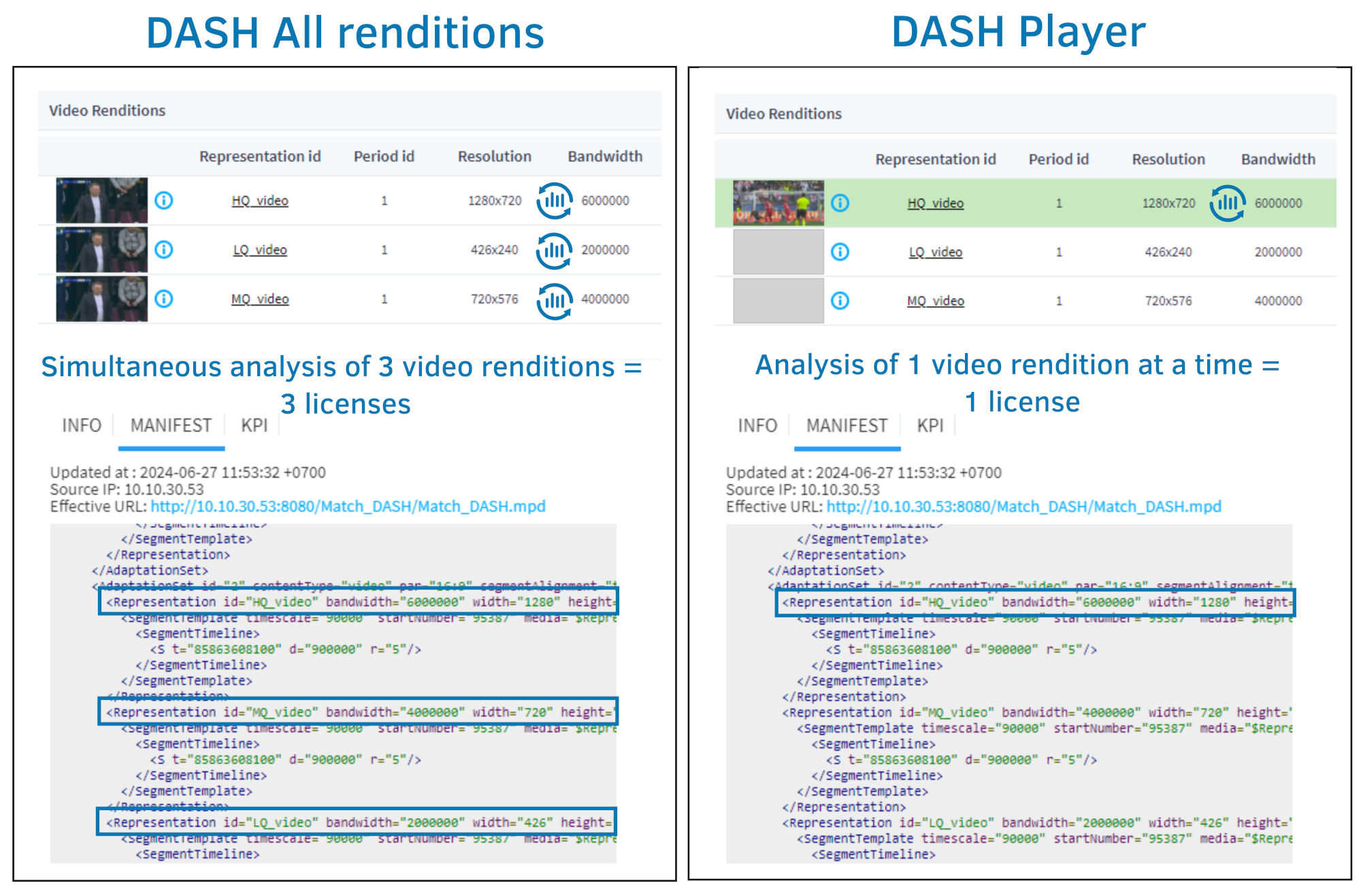 Probes can analyze DASH services in two modes, and each mode requires a different number of licenses. In the “Player” analysis mode, the system analyzes a stream with the highest bitrate supported by the network at the moment, like in a media player. Since only one Video Representation is analyzed at a given moment of time, only one license is required.