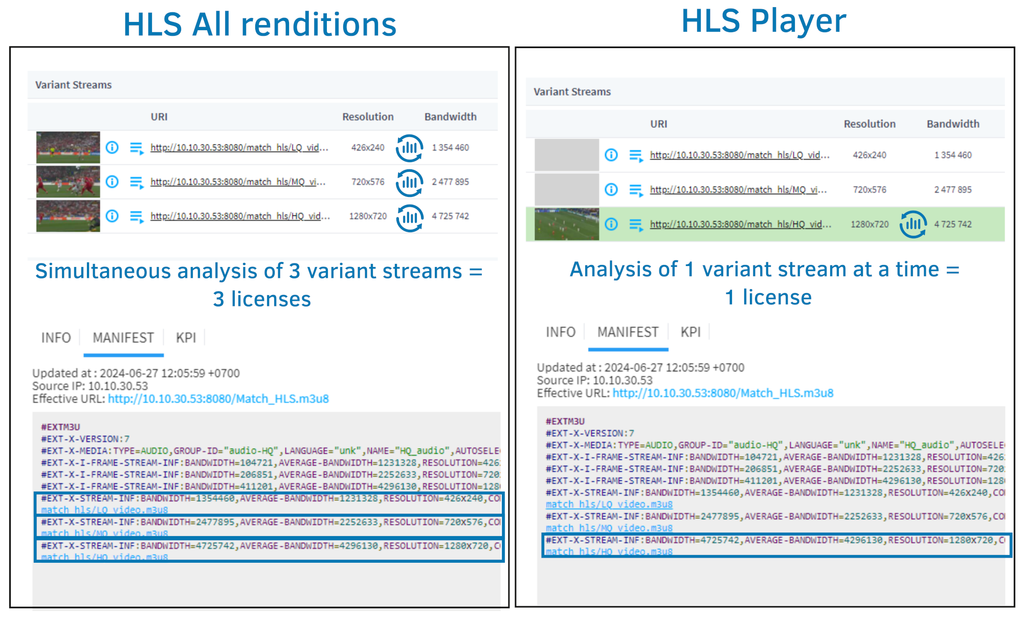 Probes can analyze HLS services in two modes, and each mode requires a different number of licenses. In the “Player” analysis mode, the system analyzes a stream with the highest bitrate supported by the network at the moment, like in a media player. Since only one Variant Stream is analyzed at a given moment of time, only one license is required.