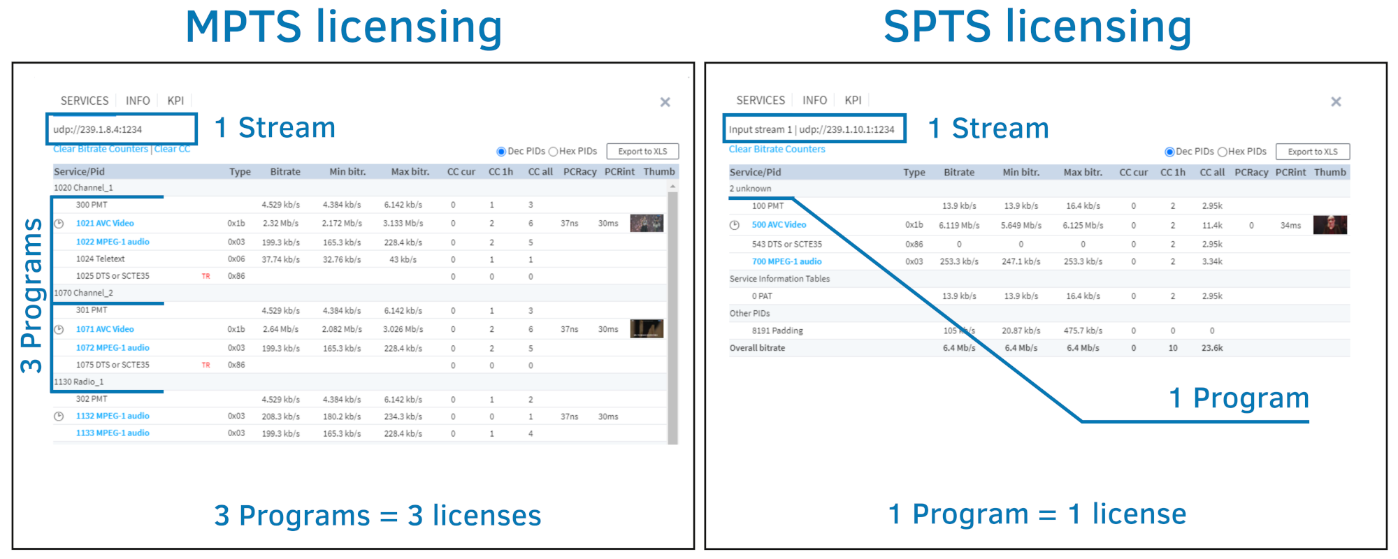 The image above shows PSI tables of SPTS and MPTS streams. An SPTS stream comprises one program; therefore, you need one license to monitor such a stream.