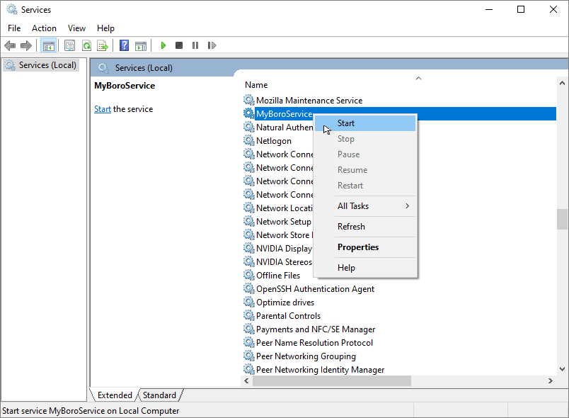 services.mscand find the installed myBoroService, right-click on the service and select Start.