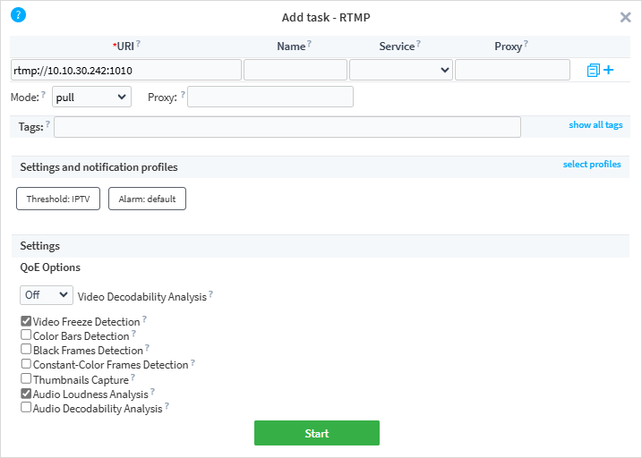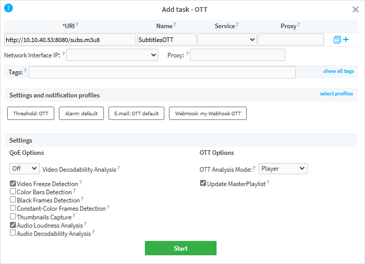 When adding a task, you need to specify a task URI and provide the probe with the access to the analyzed service. Despite the difference in protocol types, windows of starting tasks are quite similar. Below, we will consider the OTT task creation process: