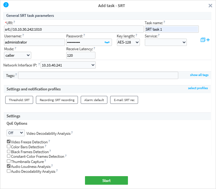 srt://0.0.0.0:portfor listening any incoming connection over IPv4. To listen any incoming connection over IPv6, specifysrt://[::]:port. Probe version 2.2: specifysrt://:portfor listening any incoming connections over IPv4 and IPv6.username and password (optionally) — a name and a password of a user for accessing an encrypted stream. A password must contain at least 10 characters. The parameters will be applied if they aren’t specified in the task settings.