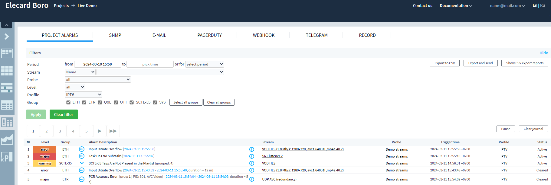 You can sort the information in the table using filters in the upper part of the screen. They may vary for different tabs. For example, the E-Mail tab allows filtering only by the event period and profile, while the SNMP tab lets you filter by the period, stream, probe, severity level, profile, and group of events.
