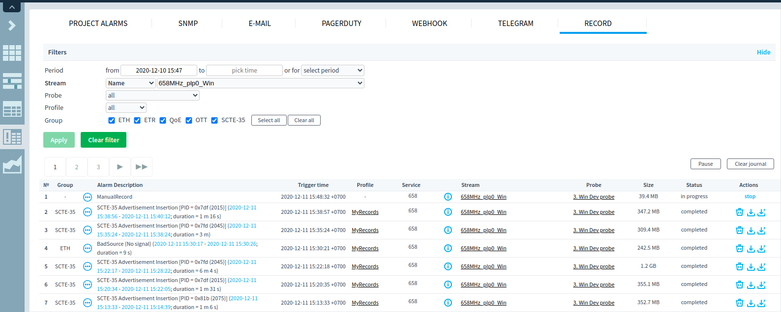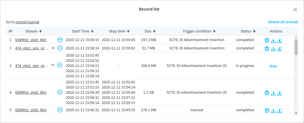 For continuous states, a record is fragmented into two periods and information for each period is displayed in the Start time and End time columns. Moreover, in case the process of automatic recording is already running and the probe detects multiple trigger firing, several additional fragments are recorded. For example, the advertisement insertion trigger for an MPTS stream may fire several times within a short period for different programs. It is guaranteed that record fragments include the beginning and end of each detected state. For the Trigger condition column, in the brackets, the amount of trigger firing follows a trigger name. For simultaneous recording, this number is the sum of all trigger firings for all synchronized tasks.