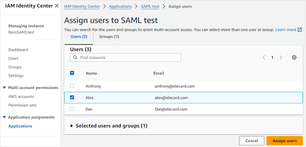 Assign users and(or) groups to the Boro application by clicking Assign users and groups. Tick the checkboxes next to the names of those users you want to add or go to the Groups tab above the list of users and tick the corresponding groups. Click Assign users. If users or groups are not created yet, create them in Users and Groups tabs on the panel to the left.