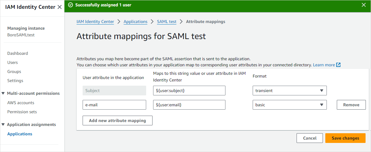 On the page of your application, click Actions and select Edit attribute mappings in the drop-down list to set the attributes for authorization.